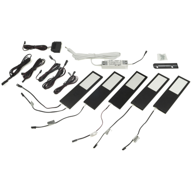 - 1x Masterleuchte, 4x Slaveleuchte, 1x LED Konverter 20 W, 6-fach Verteiler, 5x Verlängerungskabel 1800 mm, Befestigungsschrauben, Montageschablone